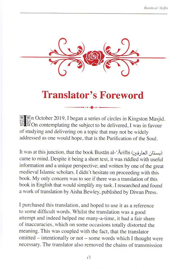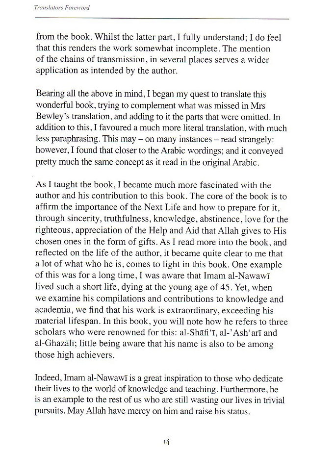 This translation by Dr Omer El-Hamdoon of the highly acclaimed spiritual book by Imam al-Nawawī allows the English reader to enjoy the beautiful morals and wonderful guidance which have been compiled by the 7th Century Hadith Master.